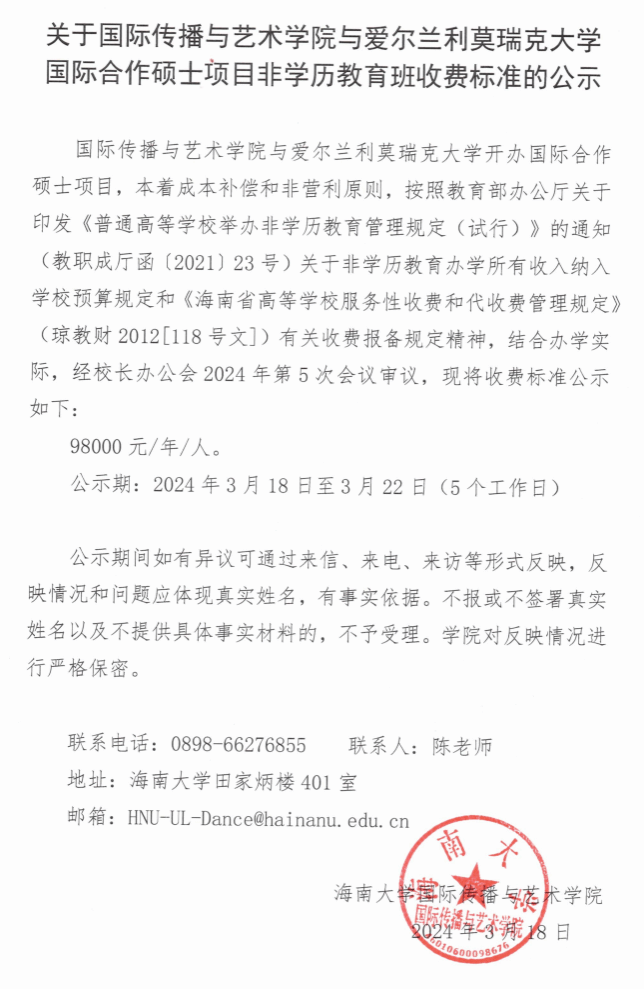 关于欧冠投注官网入口与爱尔兰利莫瑞克大学国际合作硕士项目非学历教育班收费标准的公示
