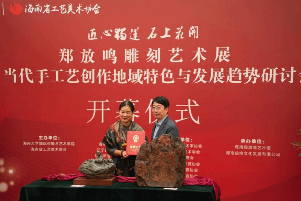 开幕式上,郑立波院长发表致辞,对郑放鸣老师在雕刻艺术领域的成就给予了高度评价,并表示希望通过此次展览进一步推动海南地区文化艺术的繁荣,为艺术创作和学术研究提供更高水平的交流平台。活动现场还举行了赠予仪式,郑立波院长为郑放鸣老师颁发了收藏证书,认为郑老师赠予的两件高水平艺术作品将丰富和拓展学院的收藏和文化资源。