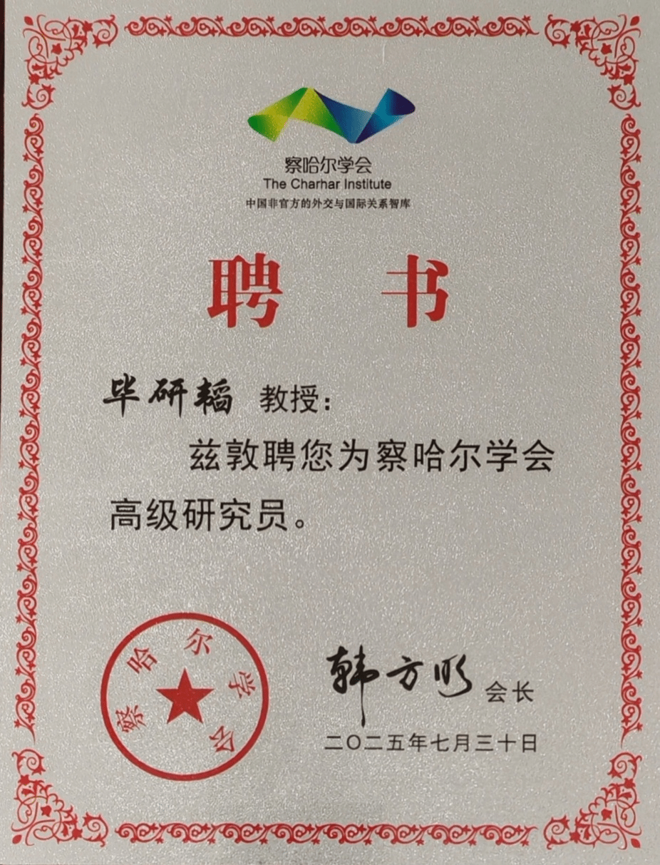 近日,欧冠官网传播学系毕研韬教授受聘为察哈尔学会高级研究员。