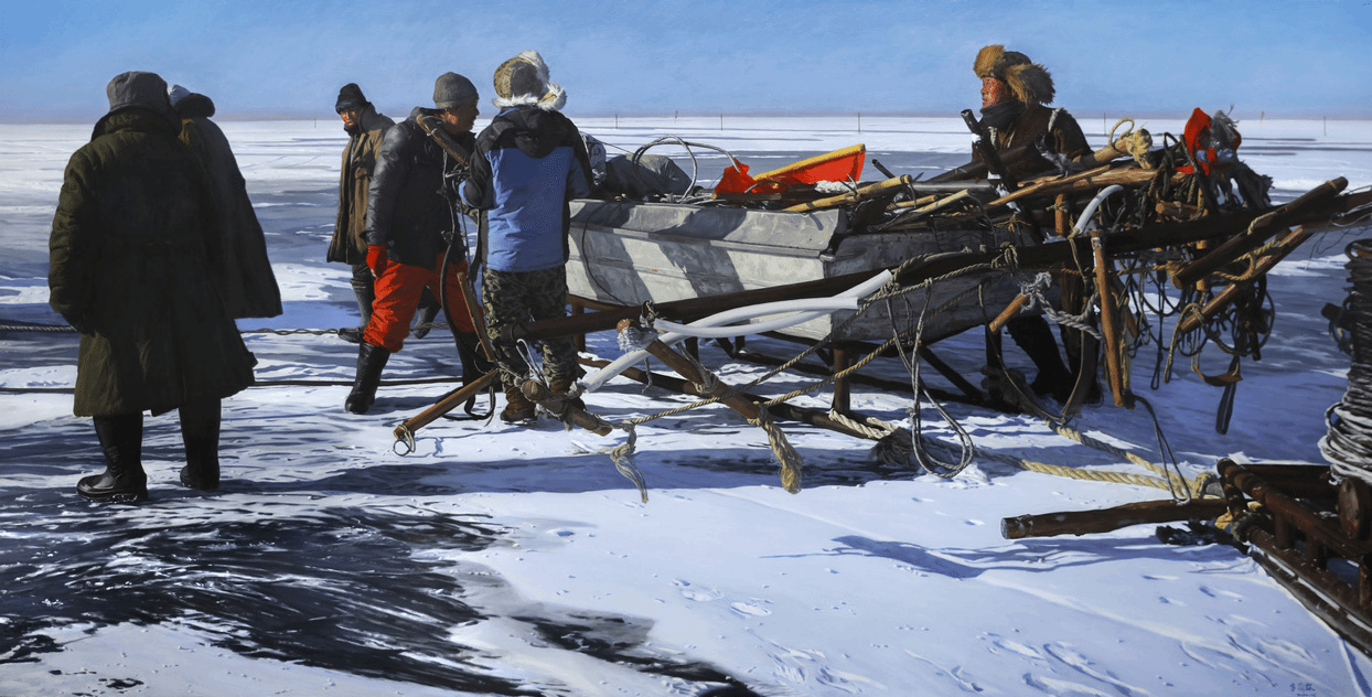 李澎霖作品 油画《查干湖冬捕——守望希望》 200X102cm 2022年