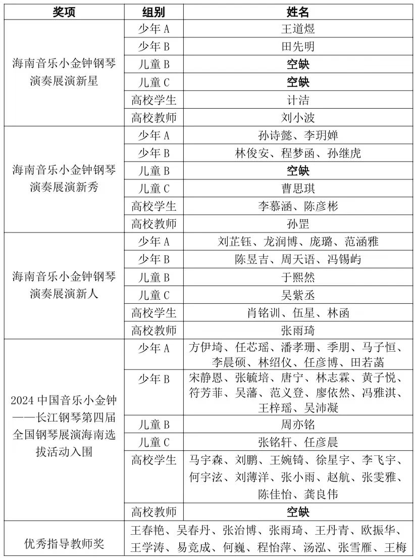 2020级本科生计洁荣获海南音乐小金钟“高校学生组”钢琴演奏展演新星奖,2021级李慕涵和2023级陈彦彬荣获新秀奖,2020级伍星、2021级林函荣获新人奖,以及青年教师孙罡荣获“高校教师组”新秀奖。欧冠官网钢琴教师吴春丹、何巍、张雪雁荣获优秀指导教师奖。